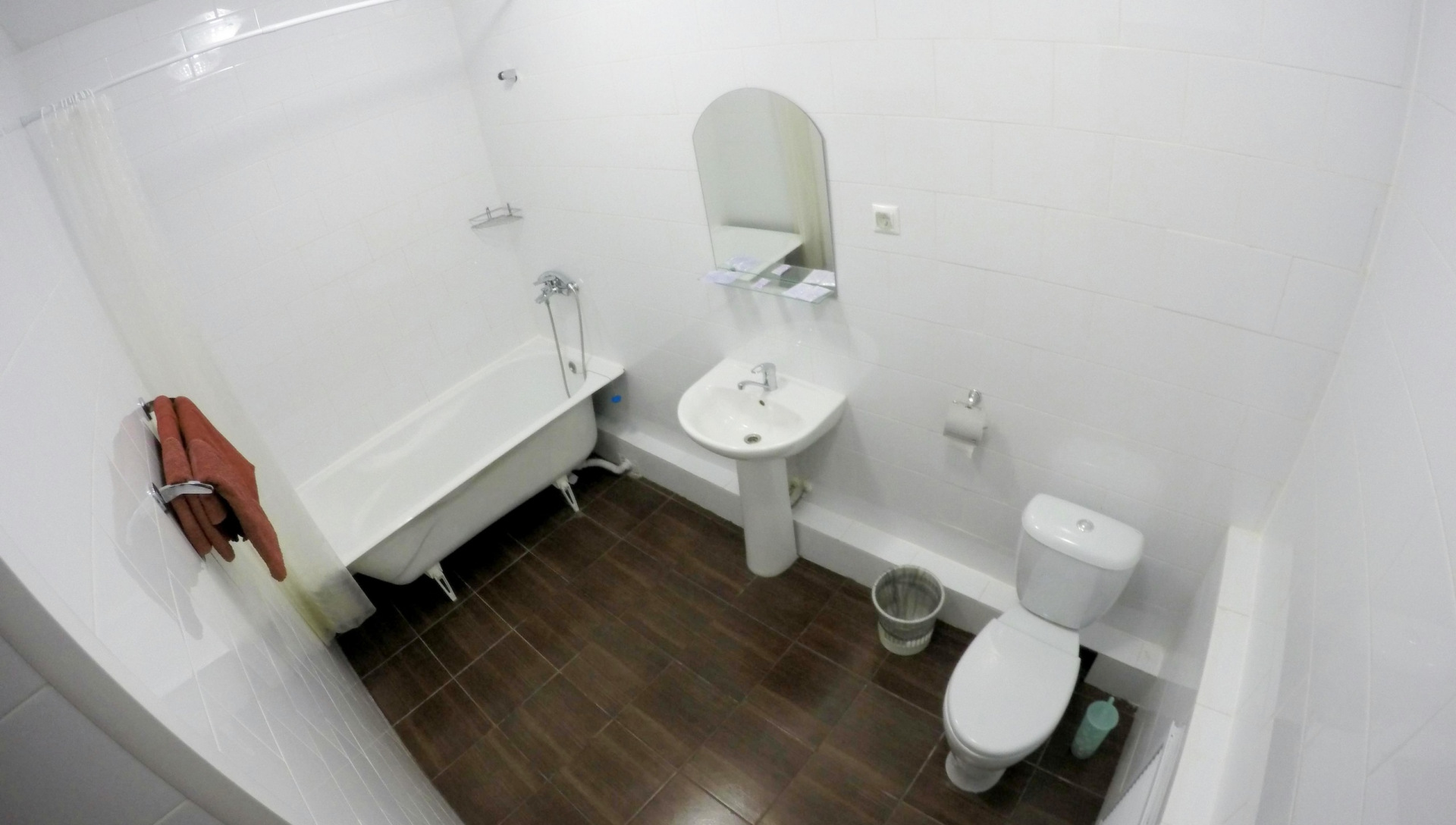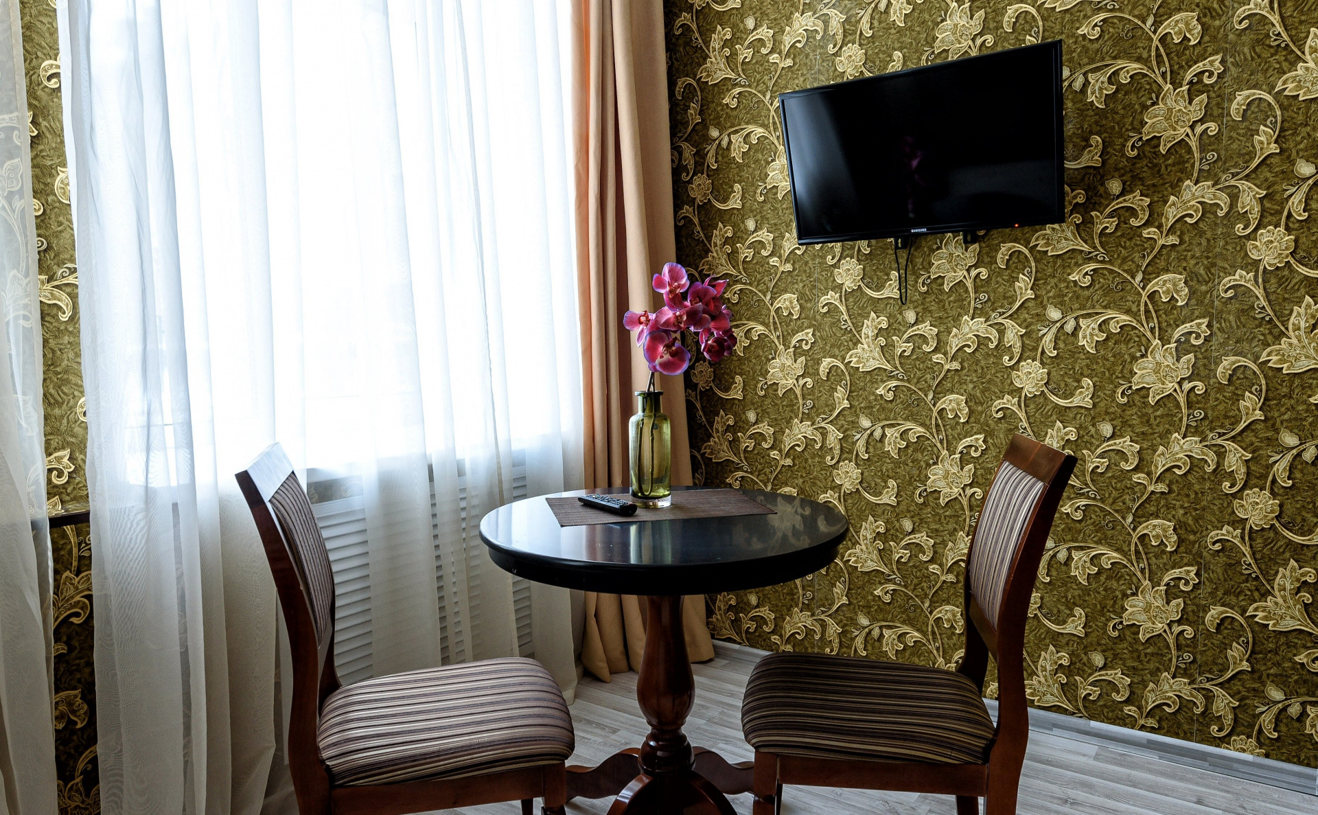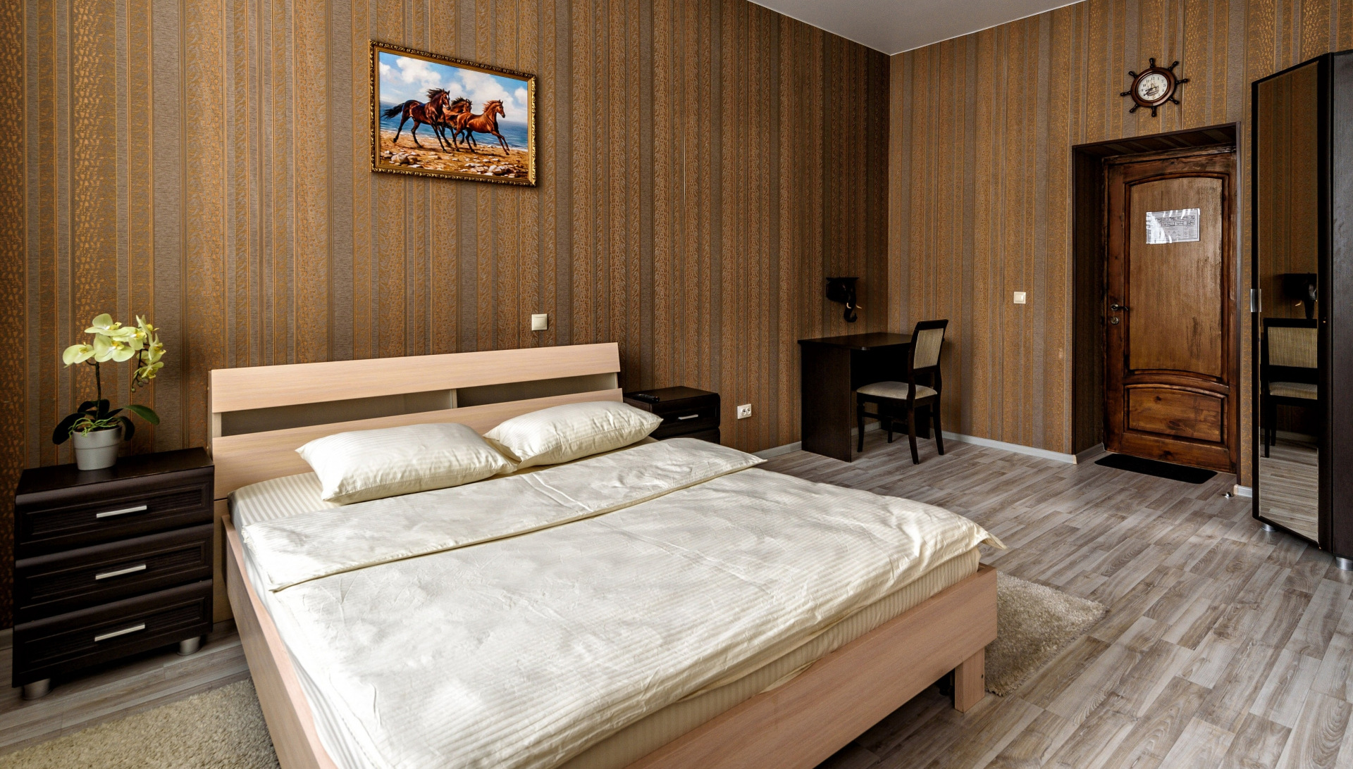Просторный уютный однокомнатный двухместный номер с широкой двуспальной кроватью и большими окнами. Современный дизайн номера.